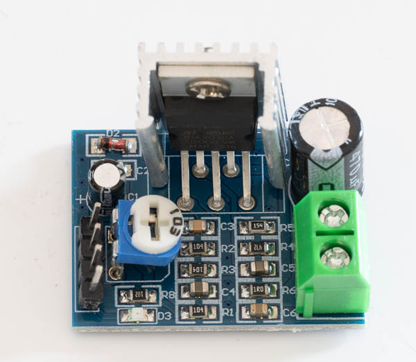 TDA2030A Audio Amplifier Module. I've noticed that some do not have the screw terminals on the right. All terminals are labeled on the bottom of the circuit board. You can buy a low cost audio amplifier from eBay or Amazon for just a few dollars. It is a TDA2030A Amplifier Module. It can put out 18 watts for a few seconds into a 4 ohm speaker; 9 watts into an 8 ohm speaker when used with a 12 VDC power supply. A 2A, 12VDC wall transformer should be adequate. Since only one of your VSDs should be going off at once, this wall transformer (I like to call them wall warts) should be able to drive several TDA2030A's. Again, you can buy these from Amazon, eBay, and probably other sources. You can get them for as little as 5 for $9. Please note, while the integrated circuit on this amplifier can probably handle 18W, I have my doubts the heat sink is adequate for more than a few seconds. This will be fine for using the amplifier with the VSD, but for continuous usage, I think it will overheat.