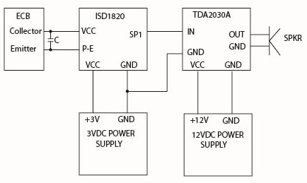 ISD 1820 Voice Module with a TDA2030A Amplifier Module for more volume. The TDA2030A module is labeled on the bottom of its circuit board. Connect 6V to 12VDC to VCC and Gnd. Use more than 6V if you need more than a few watts of audio output. Also connect its GND to the GND on the ISD1820. Connect it's IN pin to ONE of the speaker output terminals of the ISD1820. The ISD1820 uses what is known as a differential output. So you only need to use ONE of its speaker output terminals to drive the TDS2030A. There are two green screw terminals labeled OUT and GND. Connect them to your speaker. Make sure you use a speaker that is rated for enough of the output watts you intend to use. Make sure you initially set the volume control fully to the right (clockwise) before trying to avoid blowing your speaker.Yes, I know, minimum volume is usually always to the left (counter clockwise), but such was not the case with my TDA2030A amplifier module. Now you know why I test these things before writing about them! Fortunately, I had a 15W speaker so I didn't initially blow mine. It sure was loud! Other uses for the ISD 1820 The ISD 1820 has two triggers. We used the P-E (edge) trigger for the short detecting project above. The P-L trigger will play as long as the trigger is applied (or button pushed) and stop when you remove the trigger. It also has a looping function where it can be made to play continuously. The datasheet shows a switch for this. The ISD 1820 comes with two jumpers which I think one of them acts as the switch. The ISD 1820 was primarily made for voice, but if you are not too picky about fidelity, you could probably use it for a grade crossing bell. For most other sounds that don't have a lot of high frequencies like a bell, it would probably be great - a welding scene comes to mind. If you can't find a commercially available sound you want for your layout, the ISD 1820 may just be able to suit your needs. Let your imagination run wild!